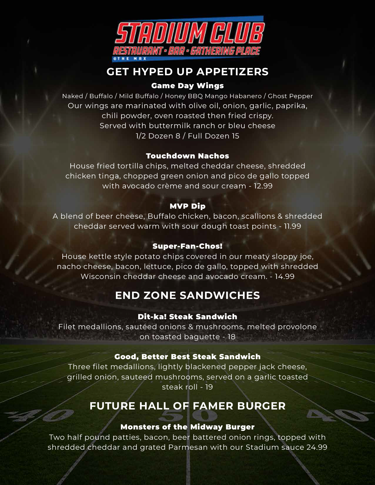 The Stadium Club’s all new menu includes great burgers, wings, salads, homemade soups, steaks, seafood, daily Chef specials & homemade desserts. Stadium Club has it all!