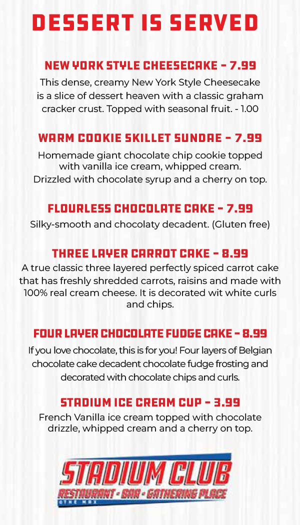 8oz. Steakhouse blend of short rib, brisket and chuck, cheddar cheese, crispy bacon, sliced avocado, Stadium sauce and crispy onion strings on a toasted pretzel bun 17