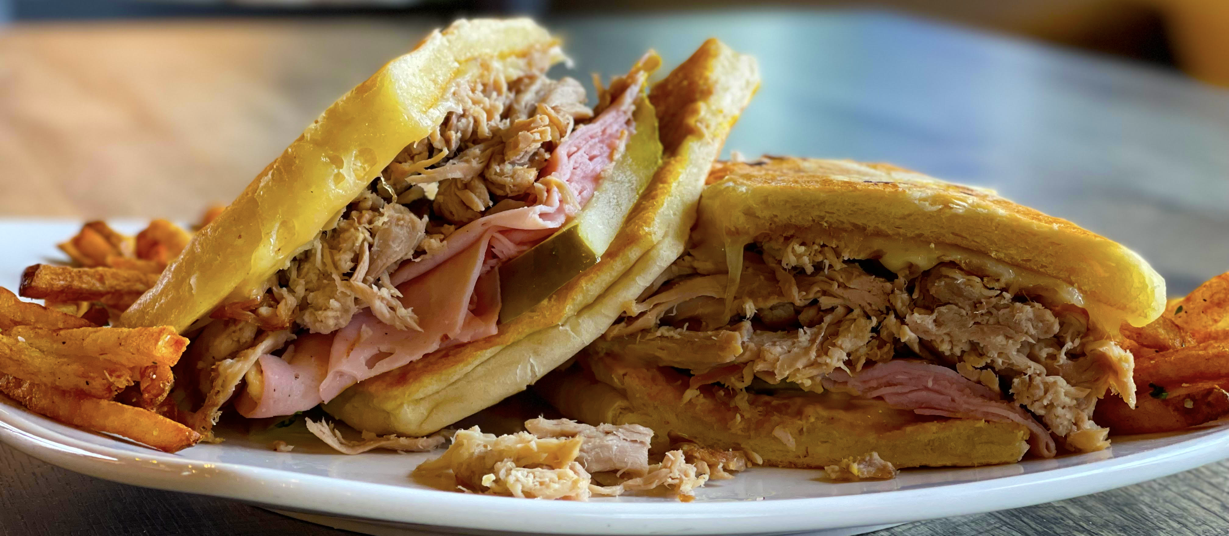 Sliced baked ham, shredded pork shoulder, Swiss cheese, pickle, signature stadium mustard